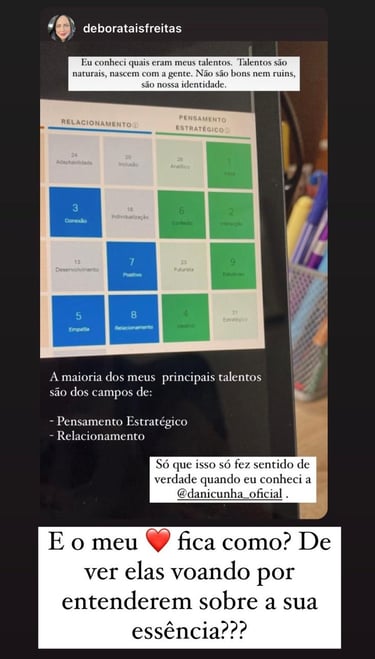 E sim, é através de uma metodologia certificada mundialmente que você será analisada e receberá os seus 5 principais talentos, além de, num acompanhamento íntimo, aprenderá como utilizá-los a seu favor no seu dia a dia.